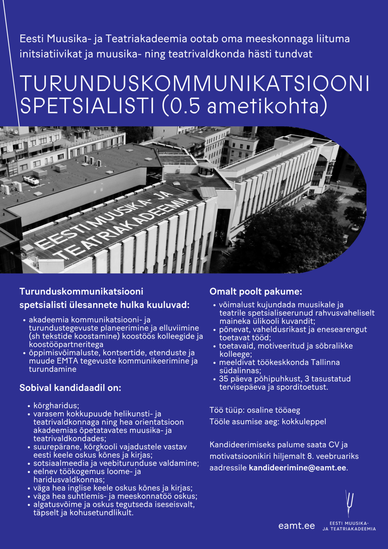 Eesti Muusika- ja Teatriakadeemia akadeemiliste töötajate ja akadeemiliste üksuste juhatajate ametikohtade loomine ja täitmine toimub vastavalt EMTA akadeemiliste ametikohtade täitmise tingimustele ja korrale. Akadeemilise ametikoha täitmiseks võib välja kuulutada avaliku konkursi, kui avatakse uus ametikoht, ametikoht on täitmata või sellel ametikohal töötava isiku töölepingu lõppemiseni on jäänud alla ühe aasta.